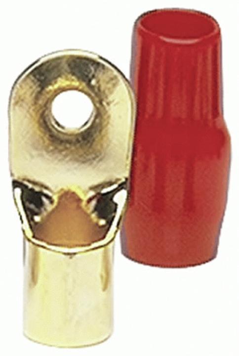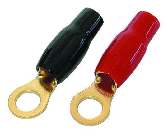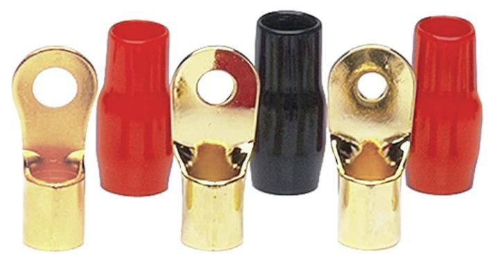 Features 1/0 AWG 3/8 Inch Gold Ring Terminal Includes 10 Red & 10 Black Vinyl Covers Available in Packs of 20