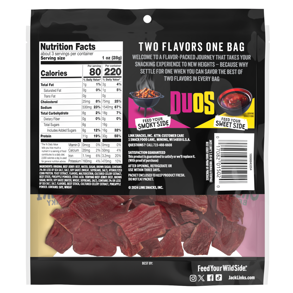{"id":14852746281325,"title":"10000043296 Jack Links Duos 2.85oz Original - Teriyaki Beef Jerky","handle":"10000043296","description":"\u003ch3\u003eFeatures\u003c\/h3\u003e\n\u003cp\u003eEnjoy the bold original Jerky flavor alongside the sweet-savory perfection of our Teriyaki beef jerky. Jack Link's Original and Teriyaki beef jerky flavors are what put jerky on the map. Now you can have both at once. In one bag, you get the delectable sweetness of Jack Link's Teriyaki beef jerky as well as the Famous original Jerky flavor – both made with 100% beef and seasoned to perfection. Enjoy a snack with the best of both worlds on your next adventure or wherever hunger strikes! \u003c\/p\u003e\n\n\u003cli\u003eMade with 100% beef\u003c\/li\u003e \n\u003cli\u003eLow Calorie Snack\u003c\/li\u003e\n\u003cli\u003e2 delicious, iconic flavors in 1\u003c\/li\u003e\n\n\u003cli\u003eSeasoned to perfection\u003c\/li\u003e\n\u003cli\u003e11 grams of protein in each serving\u003c\/li\u003e","published_at":"2026-01-05T12:30:00-06:00","created_at":"2025-12-17T10:43:08-06:00","vendor":"Jack Links","type":"","tags":["brand_Jack Links","New","Outdoor Accessories"],"price":799,"price_min":799,"price_max":799,"available":true,"price_varies":false,"compare_at_price":799,"compare_at_price_min":799,"compare_at_price_max":799,"compare_at_price_varies":false,"variants":[{"id":52846448214381,"title":"Default Title","option1":"Default Title","option2":null,"option3":null,"sku":"10000043296","requires_shipping":true,"taxable":true,"featured_image":null,"available":true,"name":"10000043296 Jack Links Duos 2.85oz Original - Teriyaki Beef Jerky","public_title":null,"options":["Default Title"],"price":799,"weight":172,"compare_at_price":799,"inventory_management":"shopify","barcode":"000170820150200","requires_selling_plan":false,"selling_plan_allocations":[],"quantity_rule":{"min":1,"max":null,"increment":1}}],"images":["\/\/productsourceguys.com\/cdn\/shop\/files\/DUOs-Original-Teriyaki-2-85oz.jpg?v=1767635340","\/\/productsourceguys.com\/cdn\/shop\/files\/2.85terior23_f73ee9b1-94d8-4943-922b-d492480052ae.png?v=1767635340","\/\/productsourceguys.com\/cdn\/shop\/files\/2.85terior2_87017e5d-45f5-4c6d-a62e-3f67bc1494ab.png?v=1767635340","\/\/productsourceguys.com\/cdn\/shop\/files\/2.85teri_or.png?v=1767635512"],"featured_image":"\/\/productsourceguys.com\/cdn\/shop\/files\/DUOs-Original-Teriyaki-2-85oz.jpg?v=1767635340","options":["Title"],"media":[{"alt":null,"id":52856050123117,"position":1,"preview_image":{"aspect_ratio":1.0,"height":1118,"width":1118,"src":"\/\/productsourceguys.com\/cdn\/shop\/files\/DUOs-Original-Teriyaki-2-85oz.jpg?v=1767635340"},"aspect_ratio":1.0,"height":1118,"media_type":"image","src":"\/\/productsourceguys.com\/cdn\/shop\/files\/DUOs-Original-Teriyaki-2-85oz.jpg?v=1767635340","width":1118},{"alt":null,"id":52855934058861,"position":2,"preview_image":{"aspect_ratio":1.0,"height":2084,"width":2084,"src":"\/\/productsourceguys.com\/cdn\/shop\/files\/2.85terior23_f73ee9b1-94d8-4943-922b-d492480052ae.png?v=1767635340"},"aspect_ratio":1.0,"height":2084,"media_type":"image","src":"\/\/productsourceguys.com\/cdn\/shop\/files\/2.85terior23_f73ee9b1-94d8-4943-922b-d492480052ae.png?v=1767635340","width":2084},{"alt":null,"id":52855934222701,"position":3,"preview_image":{"aspect_ratio":1.0,"height":2084,"width":2084,"src":"\/\/productsourceguys.com\/cdn\/shop\/files\/2.85terior2_87017e5d-45f5-4c6d-a62e-3f67bc1494ab.png?v=1767635340"},"aspect_ratio":1.0,"height":2084,"media_type":"image","src":"\/\/productsourceguys.com\/cdn\/shop\/files\/2.85terior2_87017e5d-45f5-4c6d-a62e-3f67bc1494ab.png?v=1767635340","width":2084},{"alt":null,"id":52856055071085,"position":4,"preview_image":{"aspect_ratio":1.0,"height":1000,"width":1000,"src":"\/\/productsourceguys.com\/cdn\/shop\/files\/2.85teri_or.png?v=1767635512"},"aspect_ratio":1.0,"height":1000,"media_type":"image","src":"\/\/productsourceguys.com\/cdn\/shop\/files\/2.85teri_or.png?v=1767635512","width":1000}],"requires_selling_plan":false,"selling_plan_groups":[],"content":"\u003ch3\u003eFeatures\u003c\/h3\u003e\n\u003cp\u003eEnjoy the bold original Jerky flavor alongside the sweet-savory perfection of our Teriyaki beef jerky. Jack Link's Original and Teriyaki beef jerky flavors are what put jerky on the map. Now you can have both at once. In one bag, you get the delectable sweetness of Jack Link's Teriyaki beef jerky as well as the Famous original Jerky flavor – both made with 100% beef and seasoned to perfection. Enjoy a snack with the best of both worlds on your next adventure or wherever hunger strikes! \u003c\/p\u003e\n\n\u003cli\u003eMade with 100% beef\u003c\/li\u003e \n\u003cli\u003eLow Calorie Snack\u003c\/li\u003e\n\u003cli\u003e2 delicious, iconic flavors in 1\u003c\/li\u003e\n\n\u003cli\u003eSeasoned to perfection\u003c\/li\u003e\n\u003cli\u003e11 grams of protein in each serving\u003c\/li\u003e"}